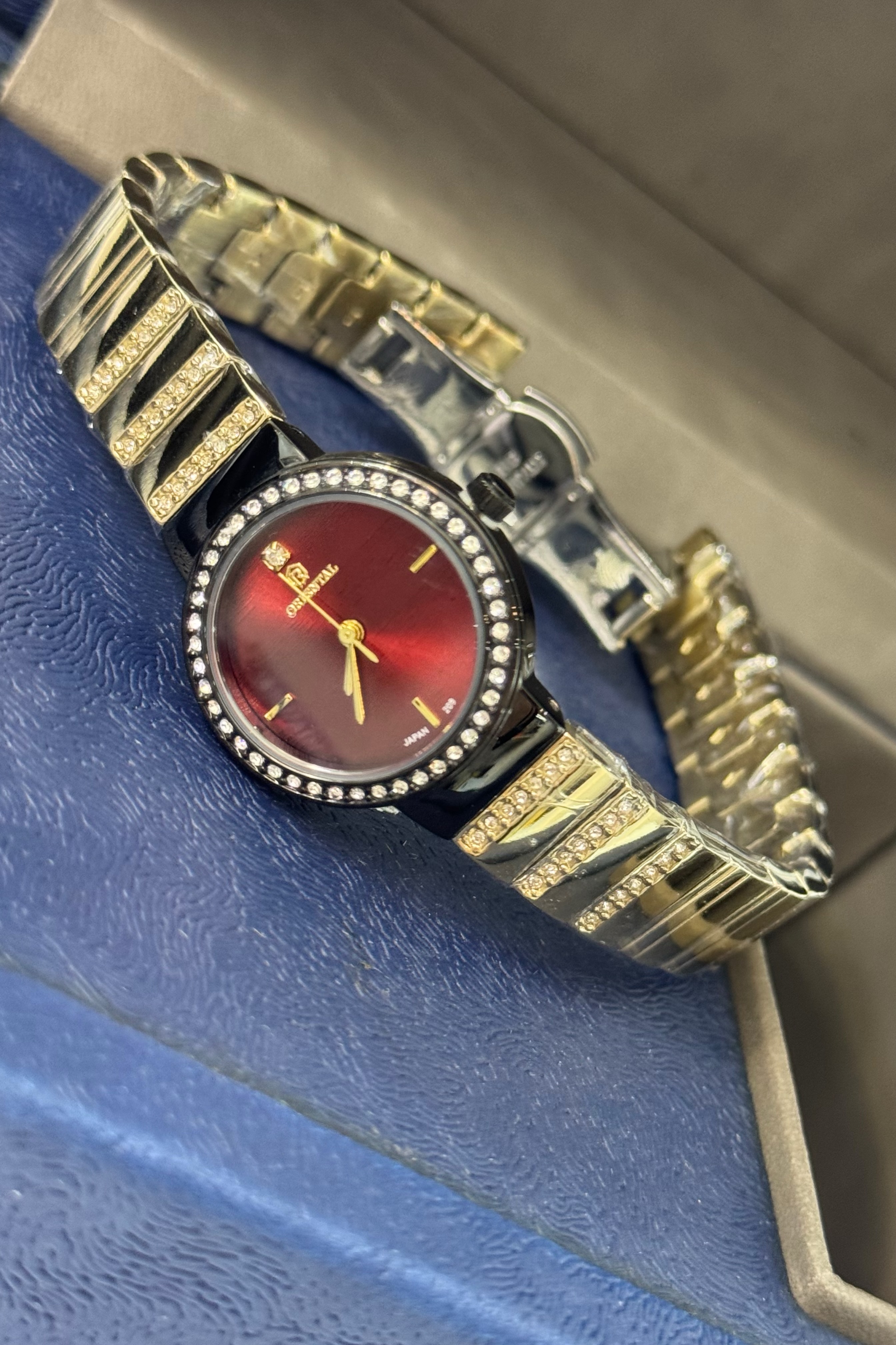 ساعت مچی زنانه اورینتال بند فلزی طلایی نگیندار با صفحه قرمز آلبالویی، جلوهای از ظرافت، لوکس بودن و استایل کلاسیک زنانه است. ترکیب بند دو رنگ سیلور و طلایی با نگینهای درخشان و صفحه قرمز آلبالویی، ساعتی خاص و منحصربهفرد ایجاد کرده که مچ دست را به مرکز توجه تبدیل میکند. این مدل برای خانمهایی طراحی شده که به استایل شیک، جواهرگونه و جزئیات دقیق اهمیت میدهند.
