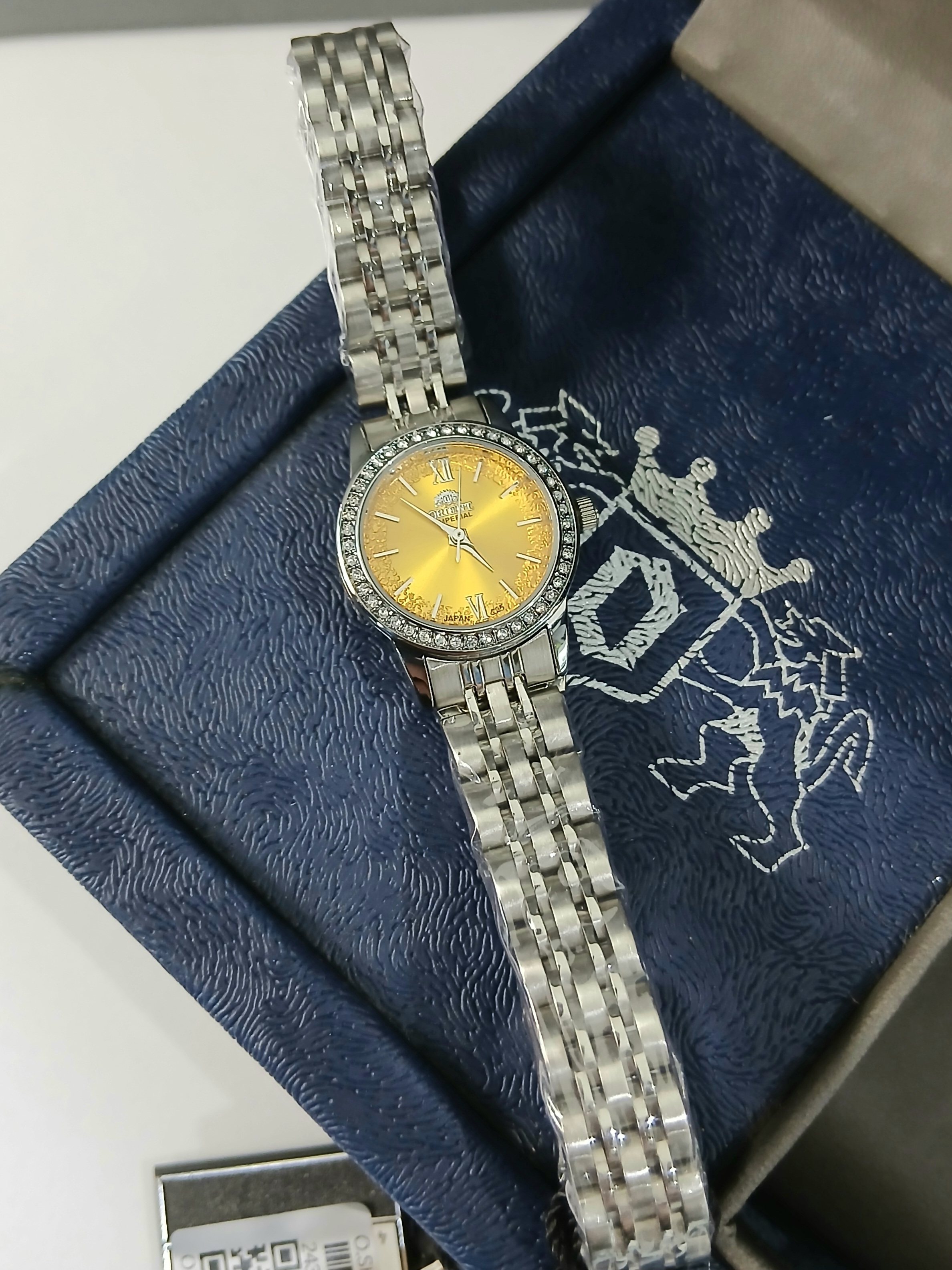 ساعت مچی زنانه سیلور دور نگین اورینت با صفحه زرد | ضدآب، استیل رنگ ثابت، آنتیآلرژی، موومنت ژاپنی و گارانتی دوساله