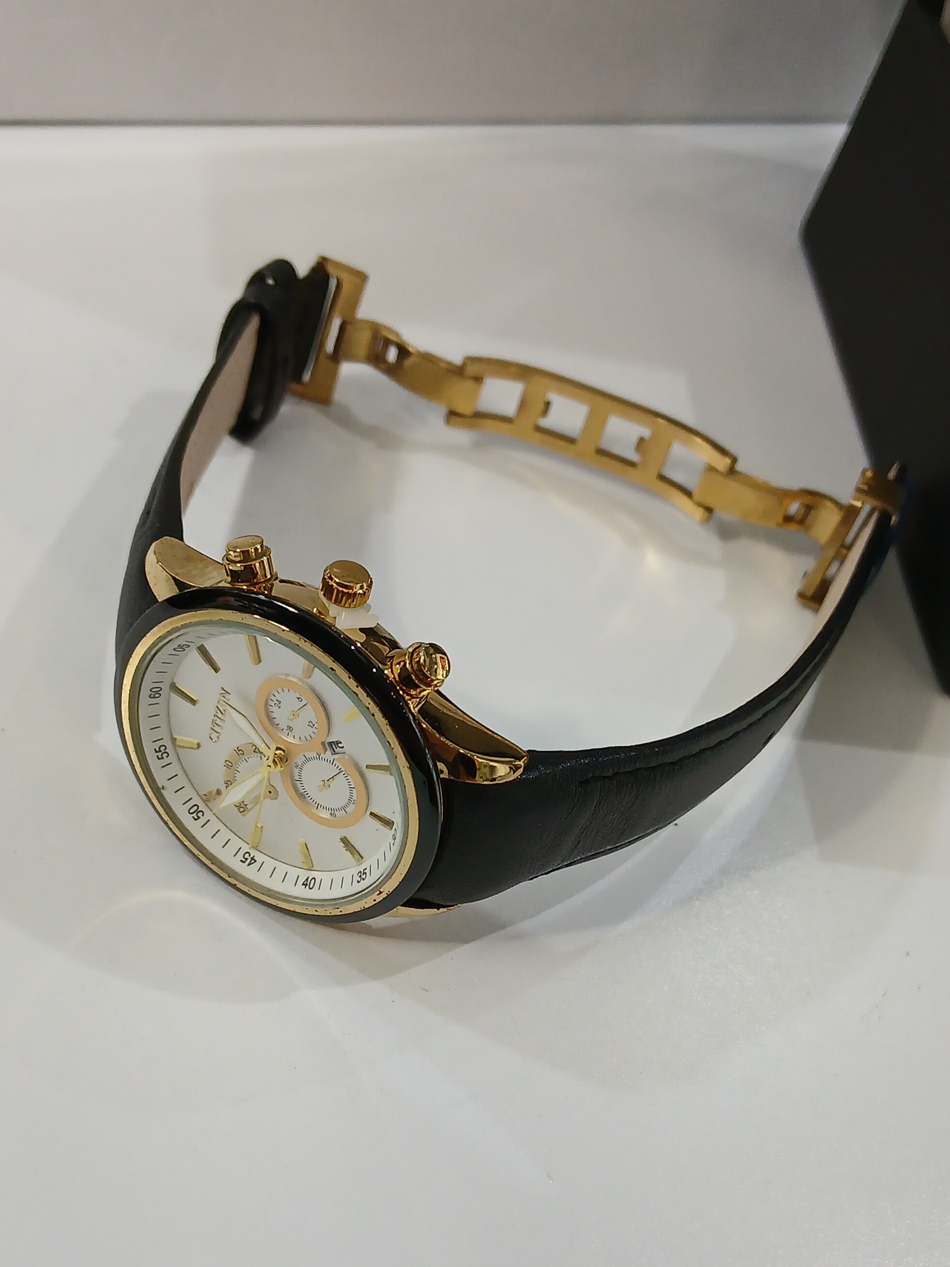 ساعت مردانه سیتیزن با بند چرمی مشکی و قاب طلایی، انتخابی شیک و موقر برای آقایانی است که به ساعت مچی، مد و استایل رسمی توجه دارند. بند چرمی مشکی با کیفیت، راحتی مناسب برای استفاده روزانه فراهم میکند و قاب طلایی جلوهای لوکس و چشمگیر به ساعت میدهد. طراحی متعادل صفحه، این مدل را برای محیط کاری، جلسات رسمی و استفاده روزمره کاربردی کرده است. این ساعت گزینهای مناسب برای هدیهای خاص و خرید اینترنتی امن محسوب میشود.