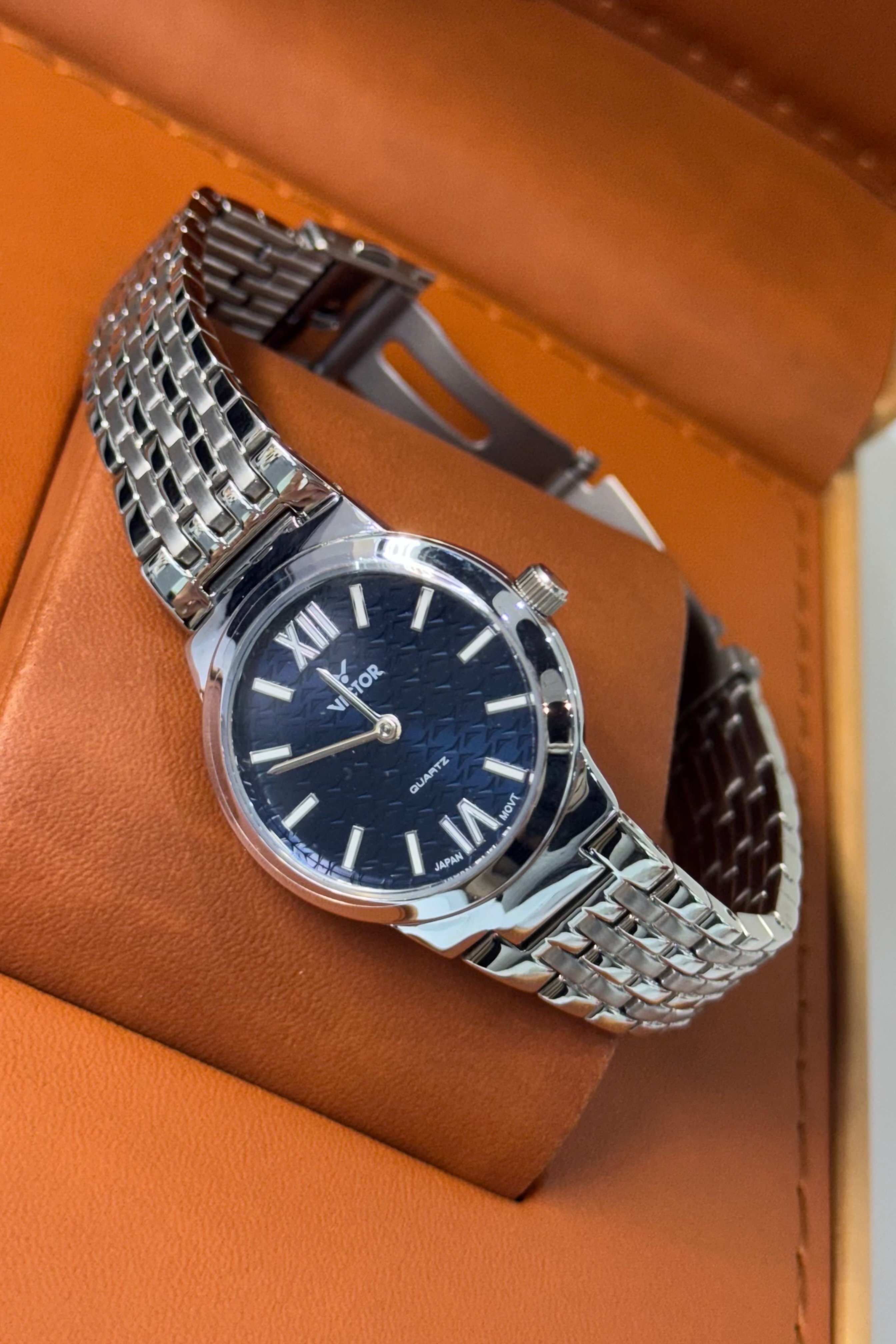 ساعت زنانه بند فلزی سیلور با صفحه سرمهای، یکی از شیکترین مدلهای کلاسیک و روزمره در دنیای ساعت مچی زنانه است که با طراحی ساده، تمیز و حرفهای خود، یک انتخاب بینقص برای خانمهایی است که به استایل مینیمال، مد روز و کیفیت ساخت اهمیت میدهند. ترکیب سیلور براق با صفحه سرمهای، ظاهری شیک و رسمی ایجاد میکند و بهراحتی میتواند با انواع استایل اداری، استایل کژوال و حتی استایل مجلسی هماهنگ شود.