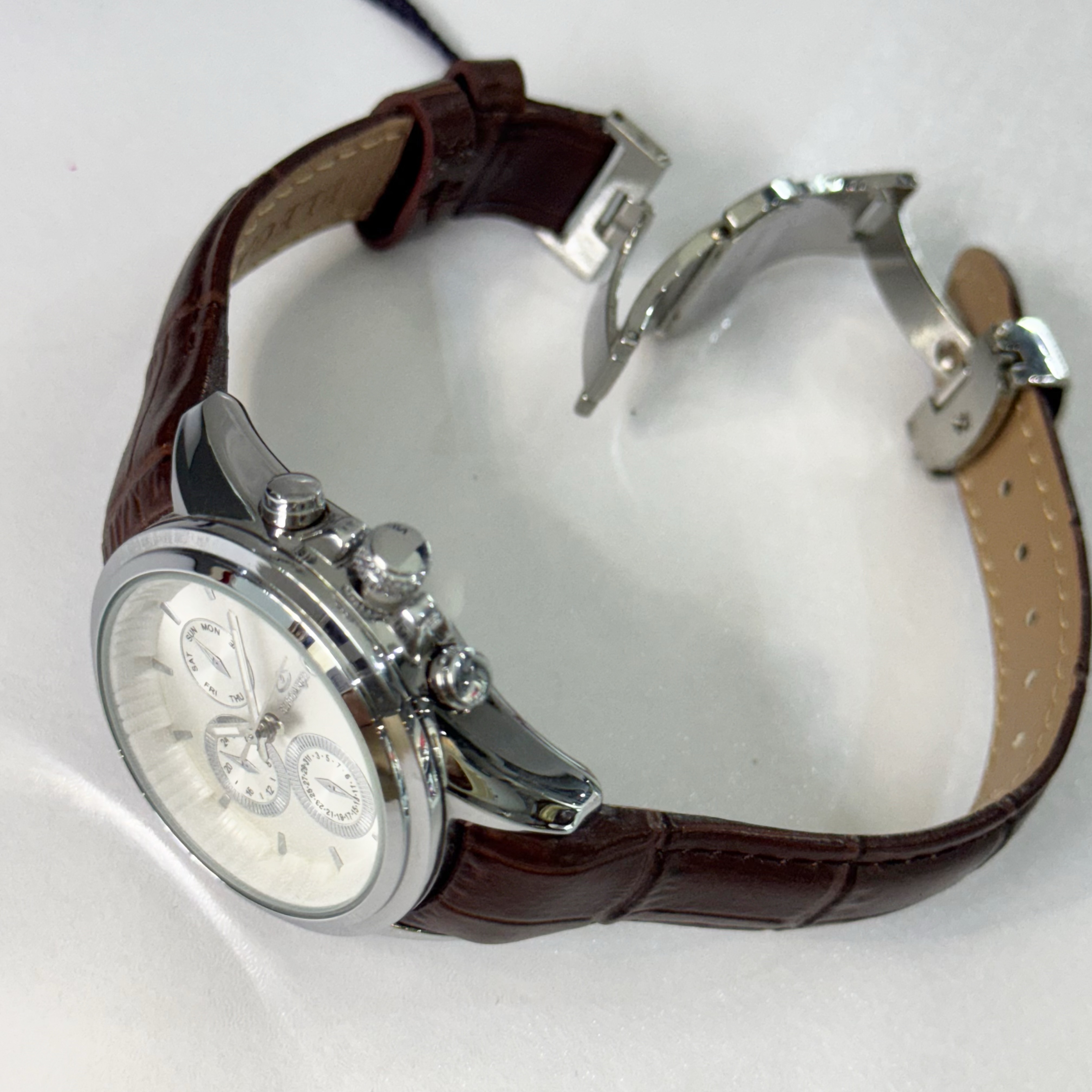بند چرمی با کیفیت بالا، راحتی کامل و حس لوکس هنگام استفاده ارائه میدهد و با متریال استاندارد، آنتیآلرژی است و برای پوستهای حساس مشکلی ایجاد نمیکند. علاوه بر این، ساعت ضدآب طراحی شده و مقاومت خوبی در برابر رطوبت روزانه دارد. طراحی کلاسیک و ساده آن باعث شده تا به راحتی با استایل روزمره، استایل اداری و استایل رسمی هماهنگ شود.