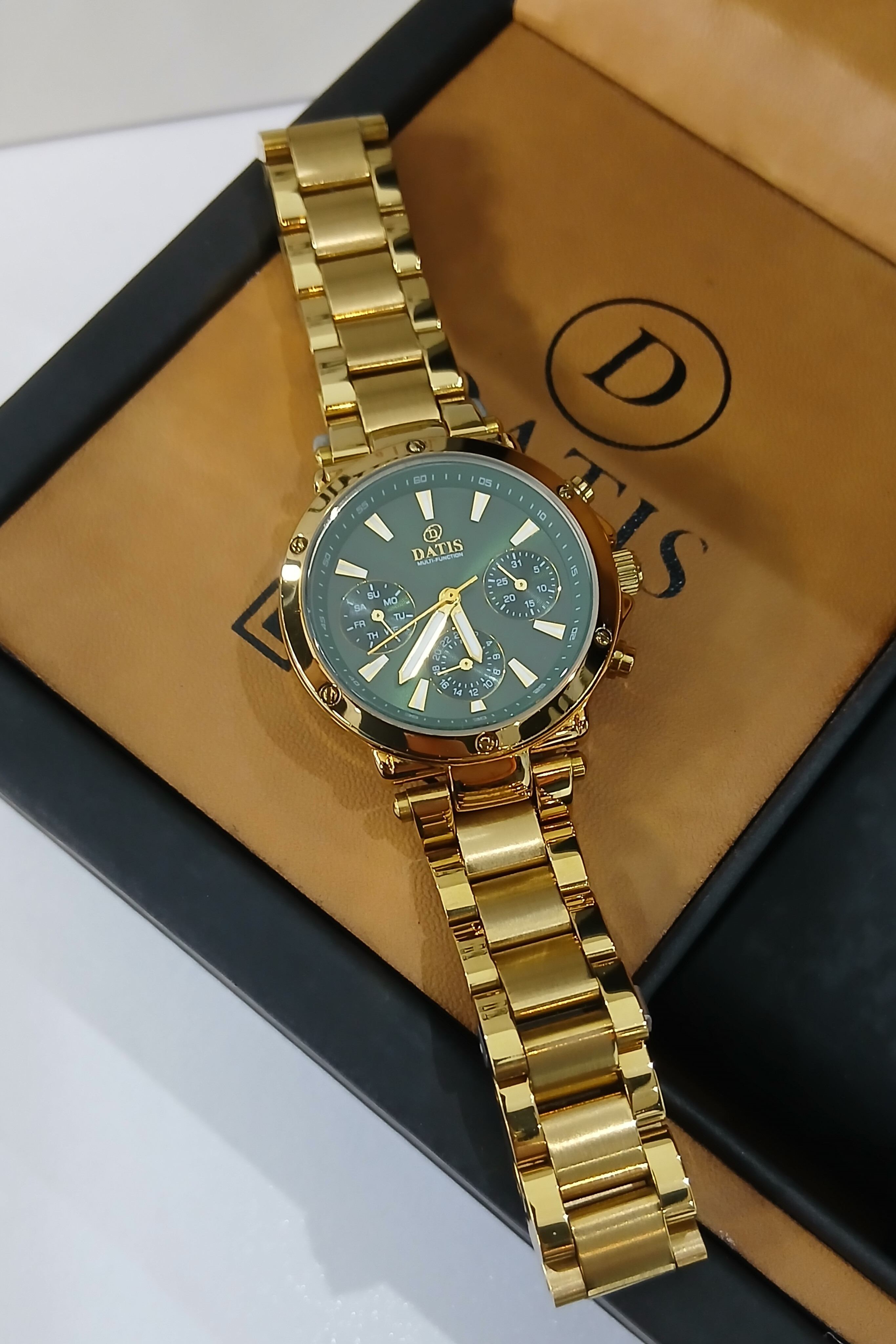 ساعت زنانه داتیس بند فلزی طلایی با صفحه سبز و نمایشگر فول دیتس، یک ترکیب کمنظیر از طراحی لوکس و امکانات کاربردی است. صفحه سبز جذاب با ایندکسهای نگیندار که با مخراجکاری ظریف نصب شدهاند، جلوهای درخشان و زنانه ایجاد میکند و در نورهای مختلف زیبایی خاصی به ساعت میبخشد. طراحی ظریف فول دیتس، امکان مشاهده تقویم کامل را فراهم میکند و این مدل را به انتخابی ایدهآل برای استفاده روزمره و رسمی تبدیل کرده است.