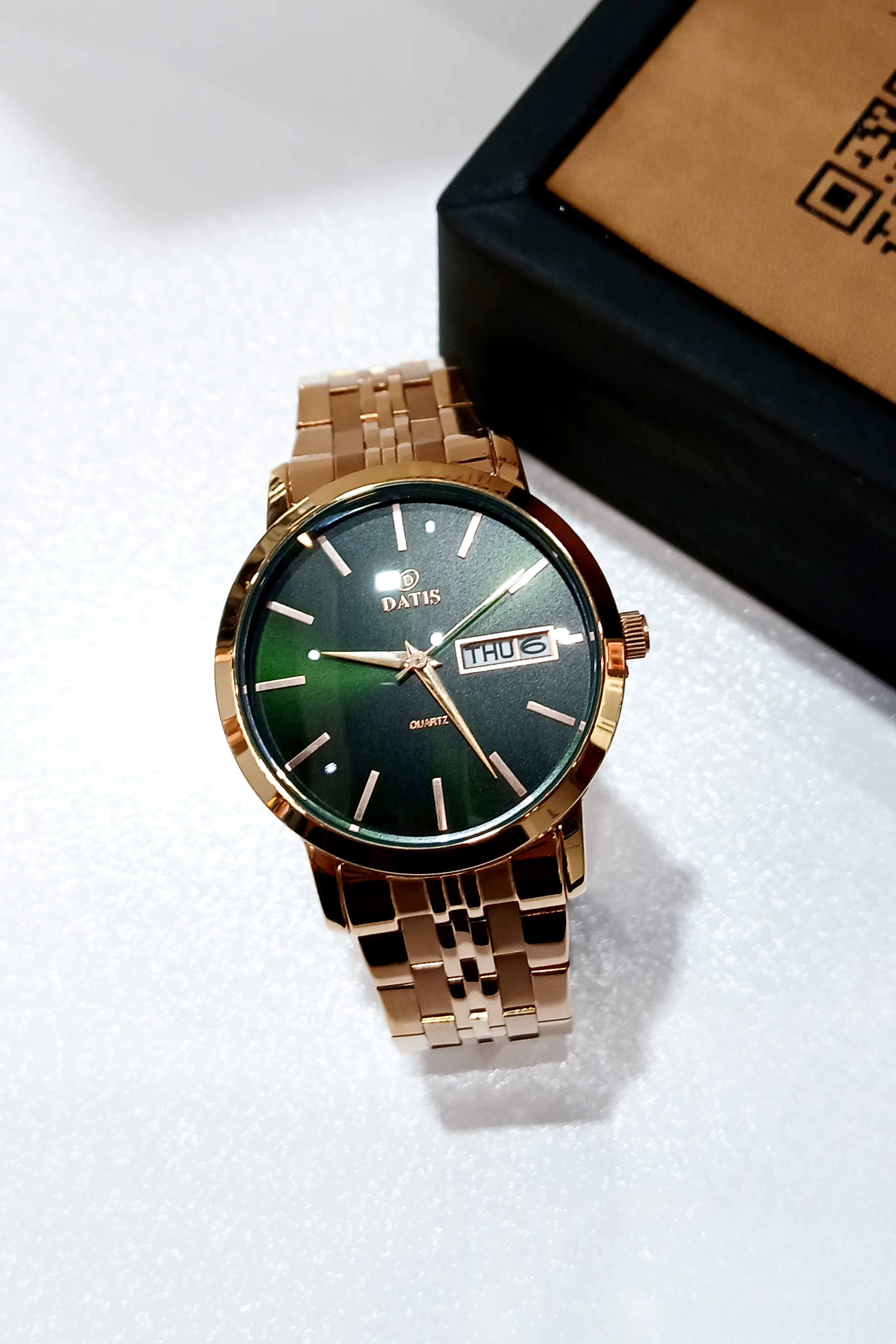 ساعت مردانه داتیس بند فلزی رزگلد با صفحه سبز، انتخابی شیک و جذاب برای آقایانی است که به دنبال ترکیب ظرافت مدرن و امکانات کاربردی هستند. صفحه سبز عمیق این مدل، ظاهری متفاوت و چشمگیر ایجاد میکند و نمایشگر تاریخ و روز هفته روی صفحه، آن را به ساعتی کاملاً کاربردی برای استفاده روزمره و محیطهای رسمی تبدیل کرده است.