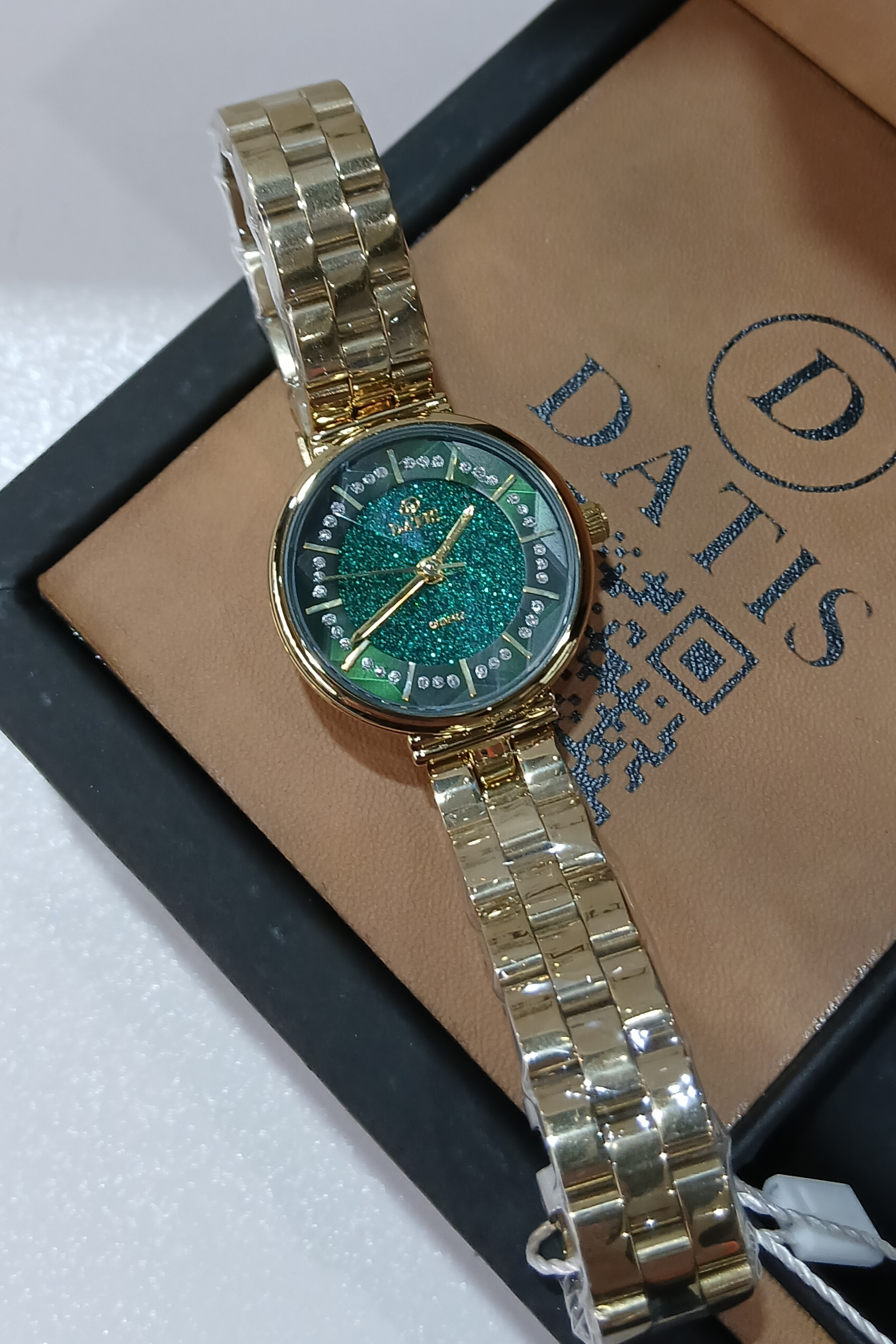 بند طلایی با کیفیت بالا و طراحی دقیق، مقاومت و دوام ساعت را تضمین کرده و حس لوکس بودن را روی مچ دستان شما منتقل میکند. ساعت زنانه داتیس طلایی با رنگ ثابت و آنتیآلرژی بودن مواد سازنده، گزینهای مطمئن برای استفاده طولانیمدت و هدیههای لوکس محسوب میشود. ترکیب سبز شاین و طلایی، انتخابی جذاب برای خانمهایی است که به دنبال اکسسوری زنانهای شیک، لوکس و درخشان هستند.