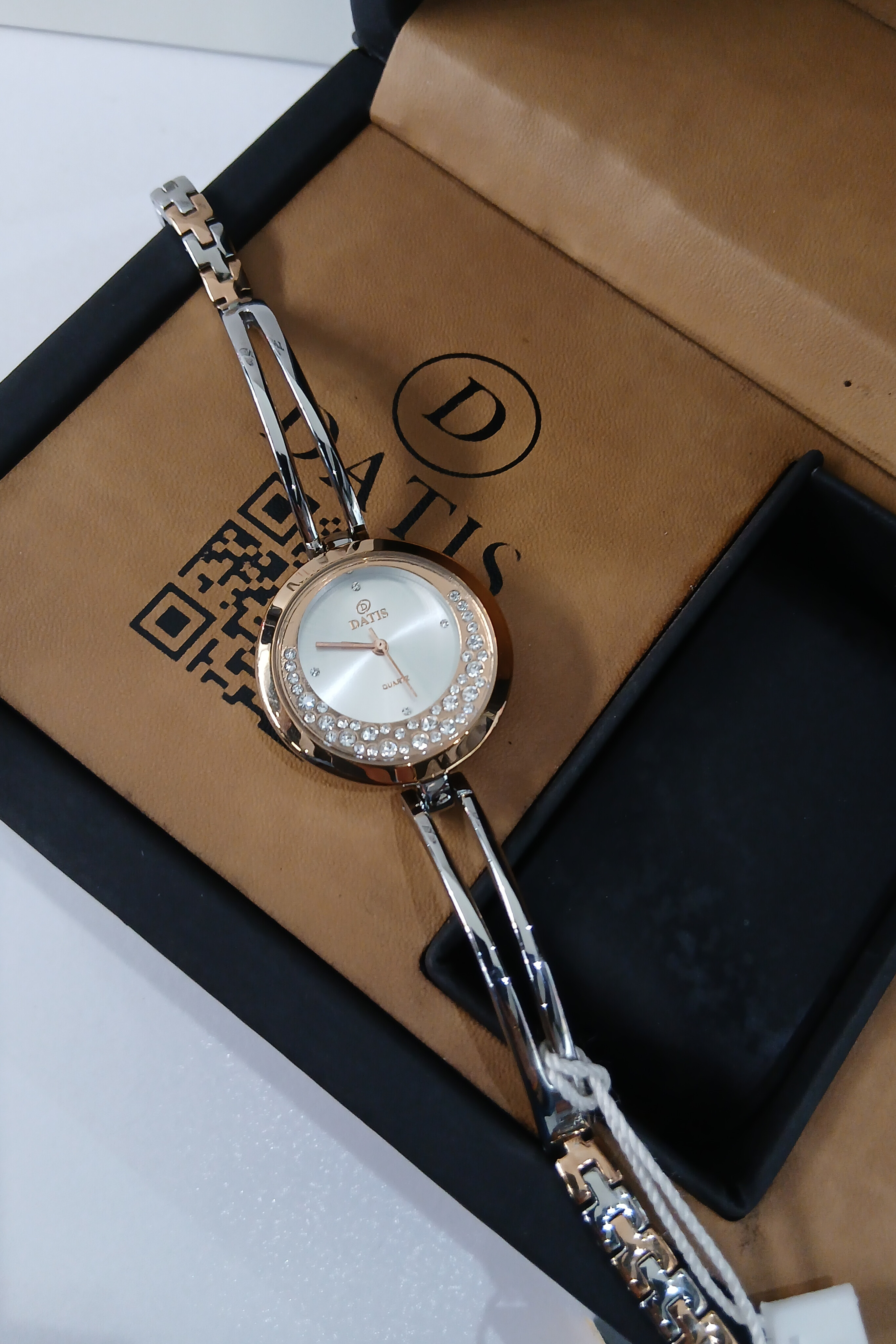 ساعت زنانه داتیس با بند فلزی دستبندی سیلور رزگلد و صفحه سفید رزگلد ظریف، ترکیبی از زیبایی، ظرافت و درخشش چشمگیر را ارائه میدهد. طراحی مجلسی و دستبندی این مدل باعث شده بهعنوان یک اکسسوری لوکس و تکمیلکنندهٔ استایل زنانه، هم برای مهمانی و مجالس رسمی و هم برای هدیهای خاص، گزینهای عالی باشد.