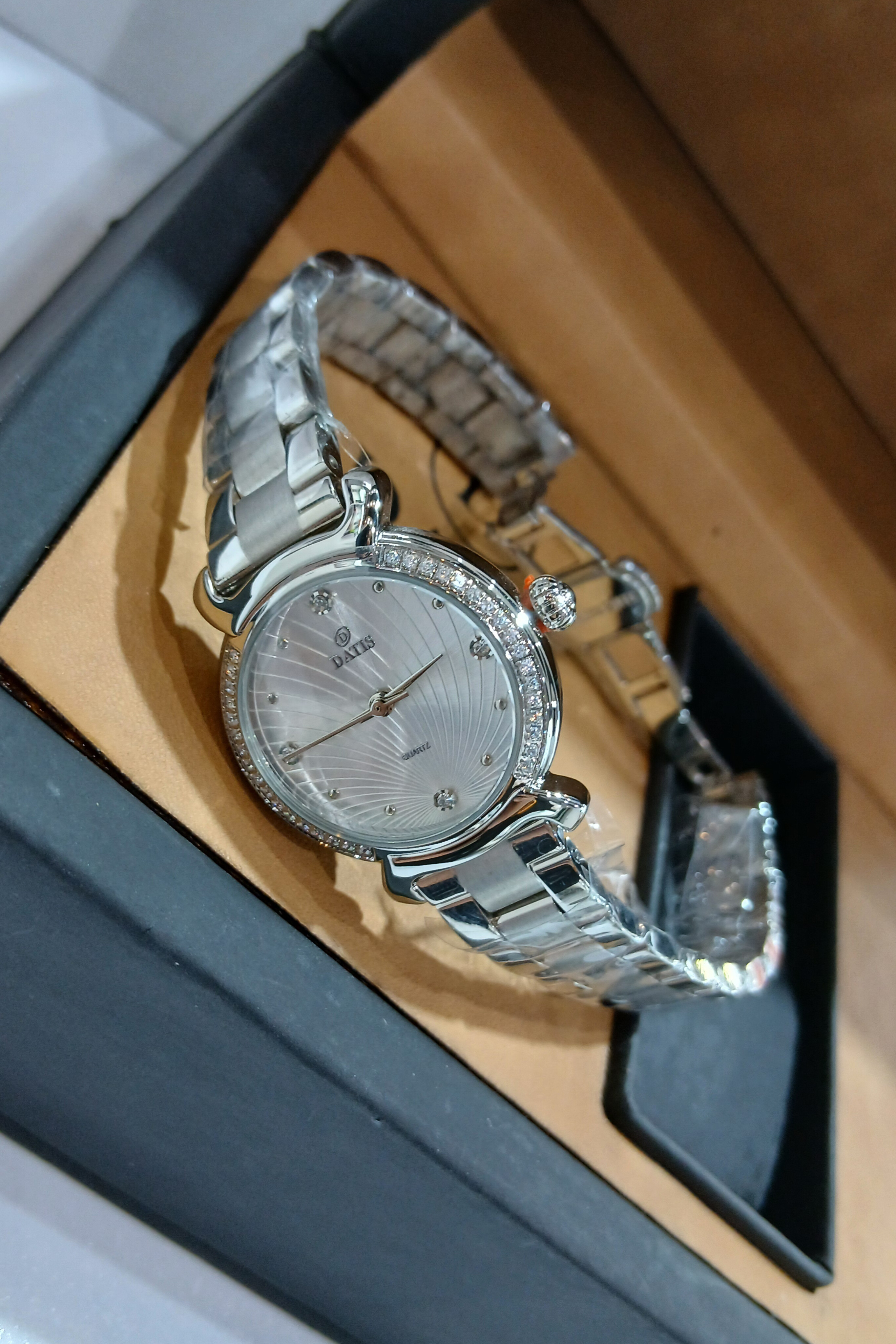 ساعت زنانه داتیس با بند فلزی تمام سیلور و صفحهای با خطوط موجی ظریف، ترکیبی بینظیر از ظرافت، مدرنیته و جلوه لوکس ارائه میدهد. در این طراحی شیک، اعداد ۳، ۶، ۹ و ۱۲ با نگینهای درخشان برجسته شدهاند و جلوهای چشمنواز ایجاد میکنند، بهطوری که نگاه هر بینندهای به ترتیب طبیعی اعداد صفحه جذب میشود و در عین حال زیبایی و درخشش خاصی به ساعت بخشیده است.