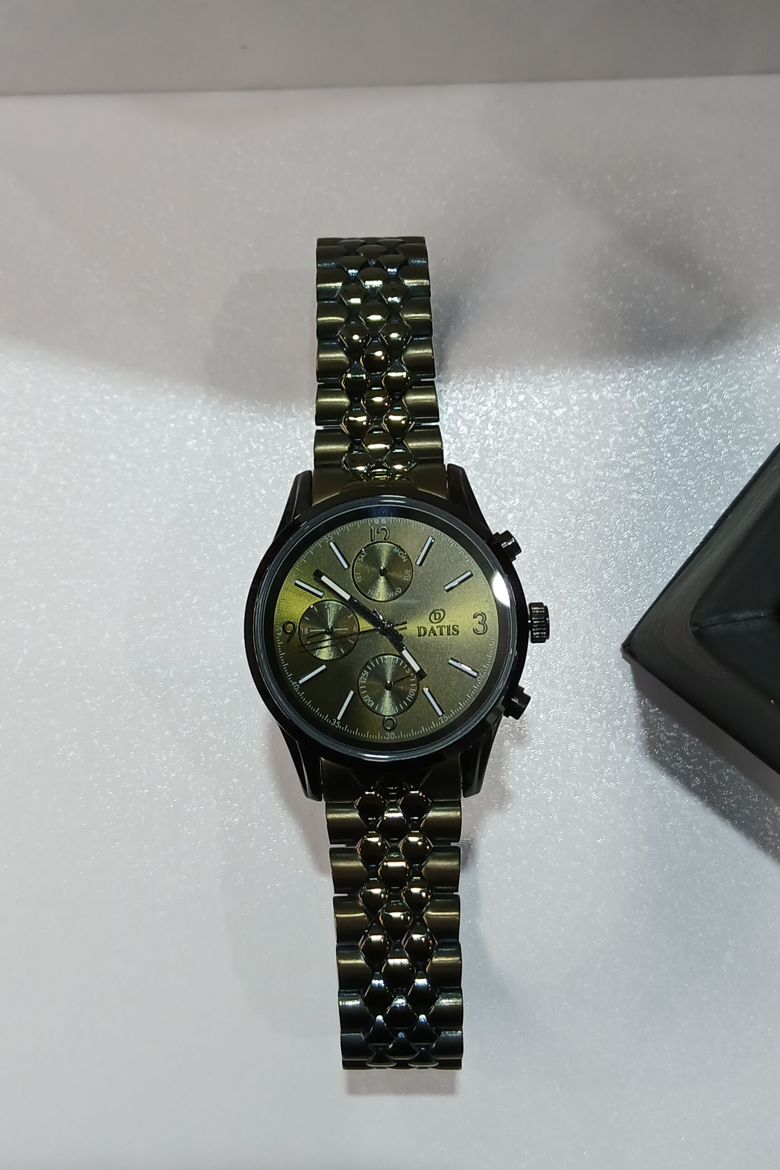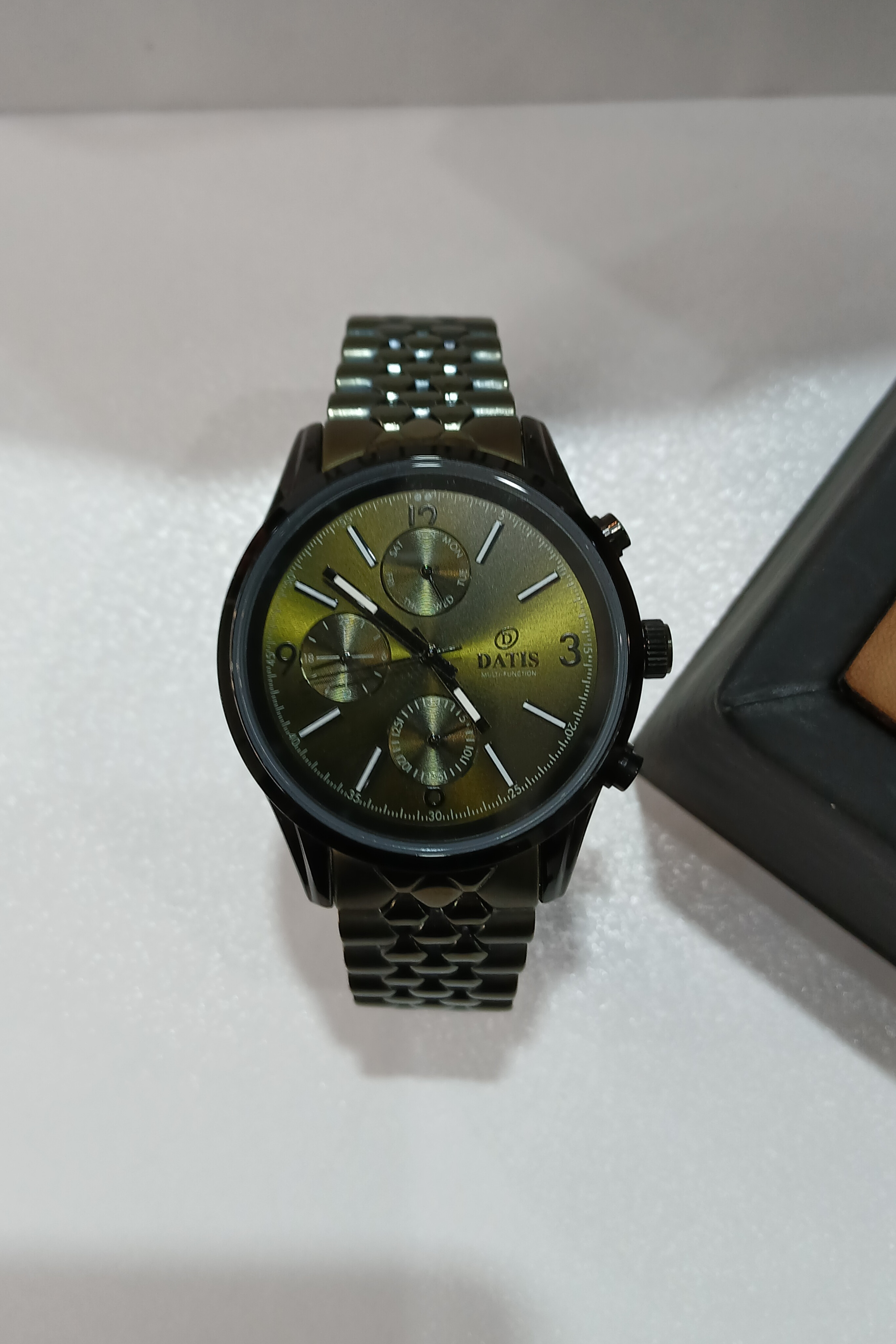ساعت مردانه داتیس با بند فلزی سبز تیره و طراحی فول دیتس، ترکیبی بینظیر از ظرافت، لوکس بودن و عملکرد حرفهای ارائه میدهد. این مدل امکان نمایش کامل تاریخ و روز هفته را فراهم میکند و استفاده از آن را در زندگی روزمره و موقعیتهای رسمی آسان و کاربردی میسازد.