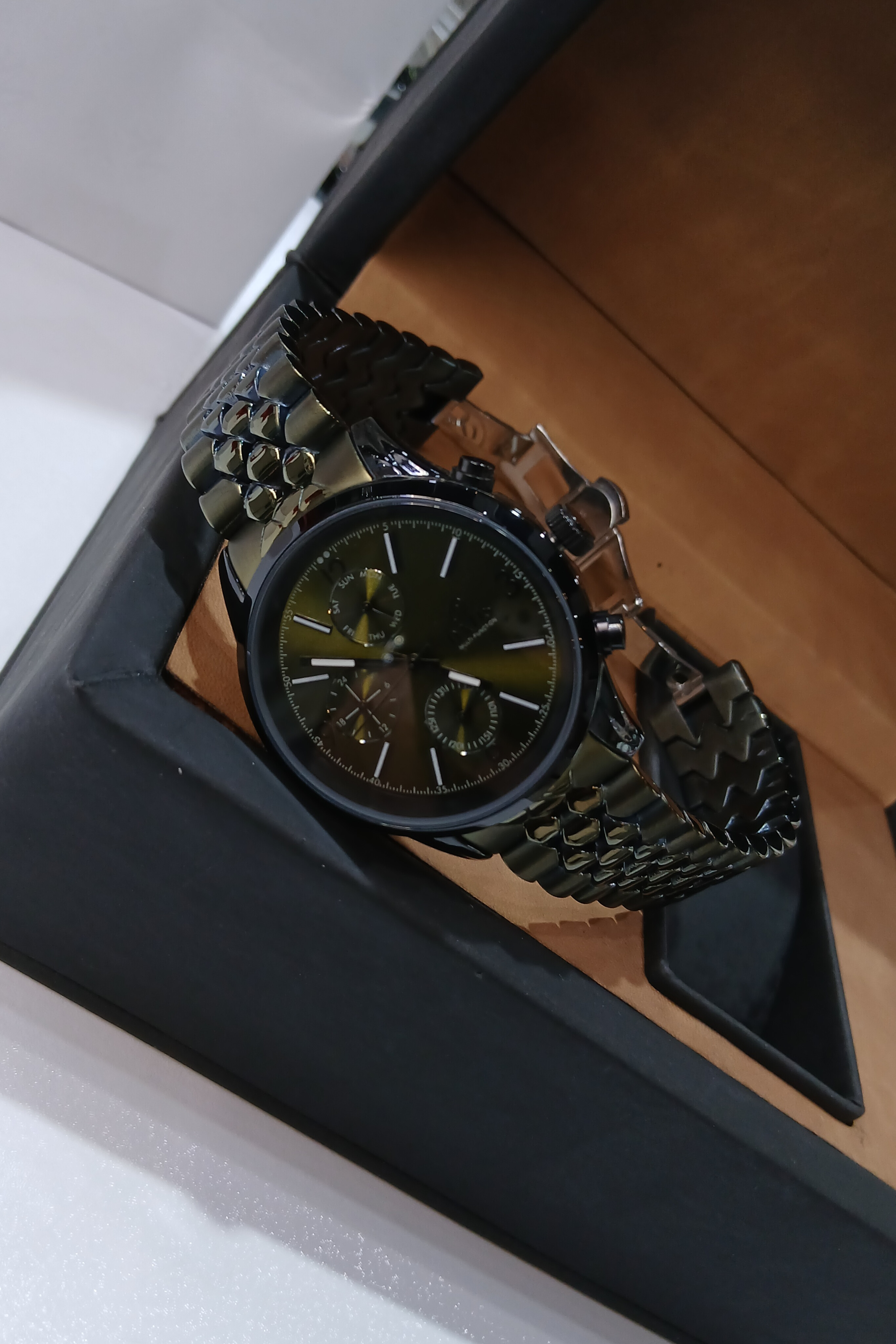 صفحه سبز تیره با طراحی مینیمال و خوانا، جلوهای کلاسیک و مدرن همزمان ایجاد کرده و با انعکاس نور، ظاهر ساعت را جذابتر میکند. بند فلزی مقاوم و خوشفرم با رنگ ثابت و ضدحساسیت، راحتی استفاده طولانیمدت را تضمین میکند و به مچ دست نمایی شیک و مردانه میبخشد.