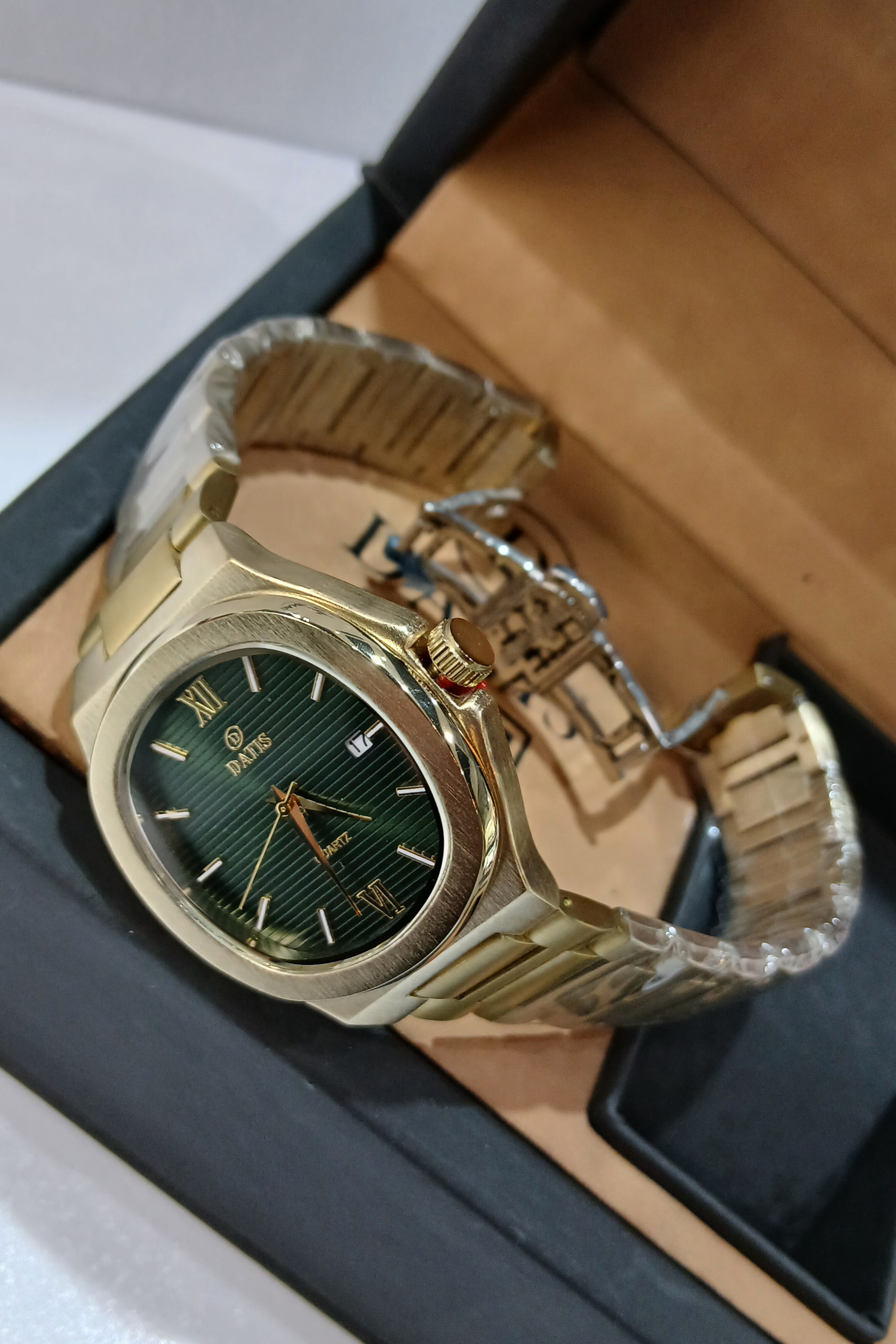 ساعت مردانه داتیس با بند فلزی طلایی و صفحه سبز جذاب، ترکیبی از ظرافت، لوکس بودن و طراحی مدرن ارائه میدهد. قاب ساعت فرم مربعی با گوشههای نرم و گردشده دارد که حس استحکام کلاسیک را با ظرافت مدرن تلفیق کرده و جلوهای متفاوت و شیک به استایل مردانه میبخشد.
